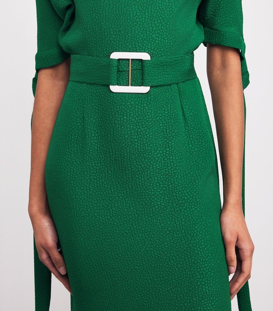 Adding intrigue to its elegant pieces, Edeline Lee loves to play with texture via its signature flou bubble jacquard, woven in Italy. Here, it imbues the Pedernal midi dress with the pebble-like hand feel on the smooth drape of the midweight fabric.