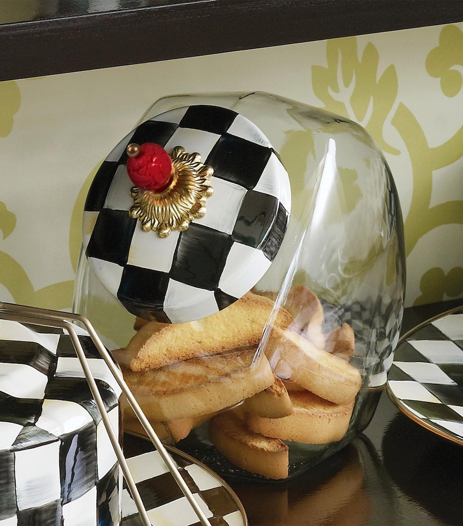 Display your favourite cookies and home-baked treats in MacKenzie Child’s Courtly Check cookie jar. It features a clear glass jar with a decorative lid covered in graphic black and white checks. The lid is made with a hand-glazed steel underbody, with hand-painted checks and a bronzed rim. The brass bobeche and glass finial knob add a luxurious finish.