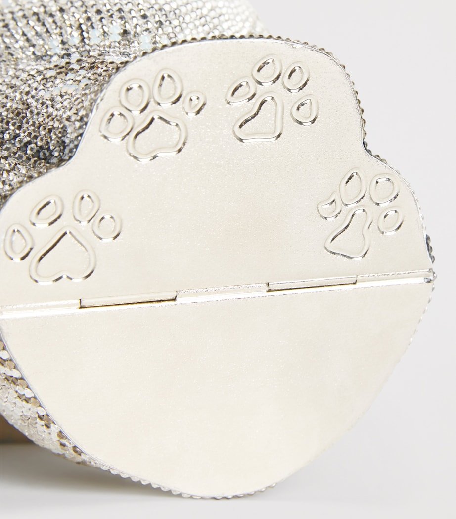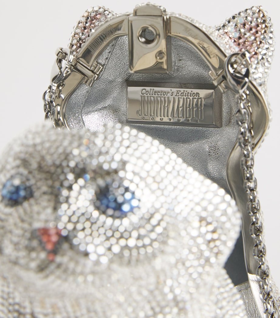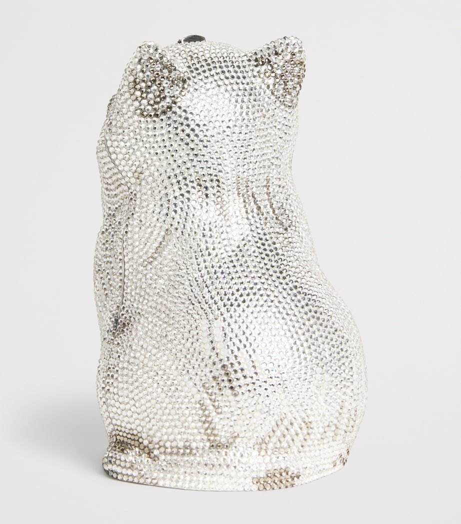 Since the 1960s, Judith Leiber has transformed evening bags into collectable works of art, with this kitten-shaped clutch furthering its legacy. Sculpted brass adopts a crystal-embellished exterior with silver-tone accents, breathing life into this feline companion. Playful yet artfully crafted, it’s a celebration of the label’s commitment to witty designs.