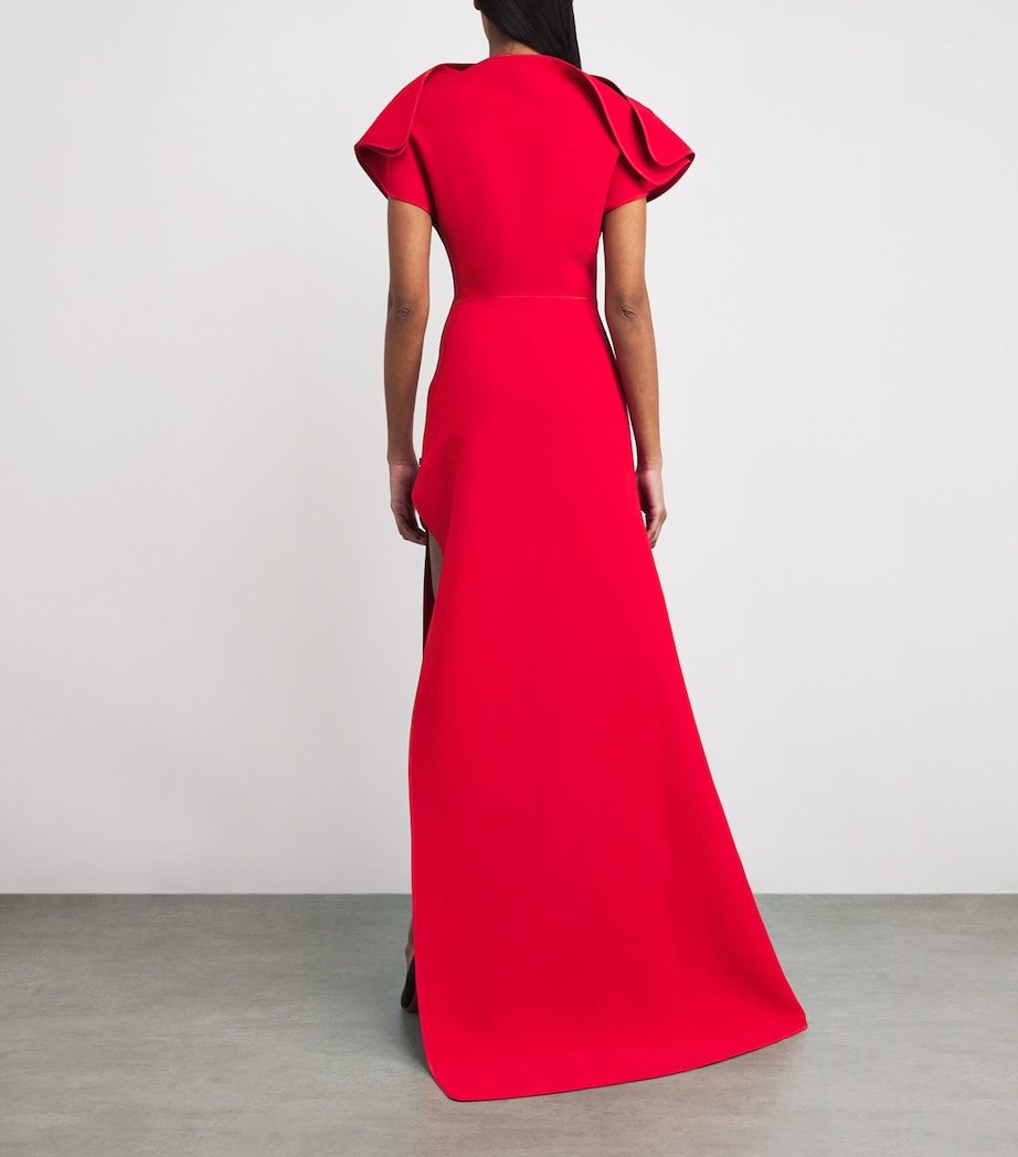 A vibrant opus of red comes alive in Maticevski’s Absolve gown, where sculptural artistry meets feminine fluidity. Defined by its dramatic proportions, this piece features a foldover boat neckline that cinches at the waist before cascading into a voluminous maxi skirt with a pooling hem. A daring high-leg split adds a theatrical flourish, amplifying its allure and commanding attention with every step.