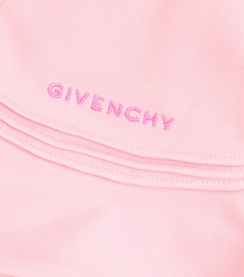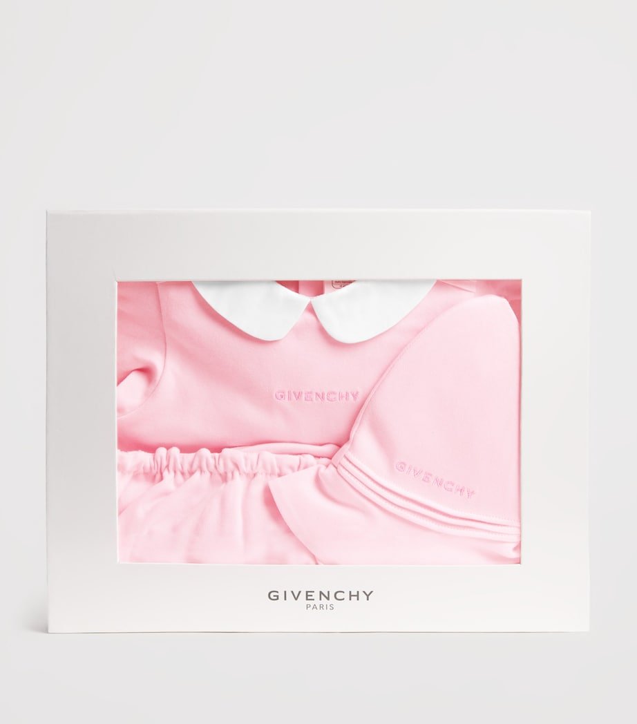 This coordinated Givenchy Kids ensemble offers a charming aesthetic for your baby’s first formal outings. The short-sleeve dress features a neat contrast collar and delicate pleated details at the shoulders, accompanied by ruffled bloomers and a protective sun hat.