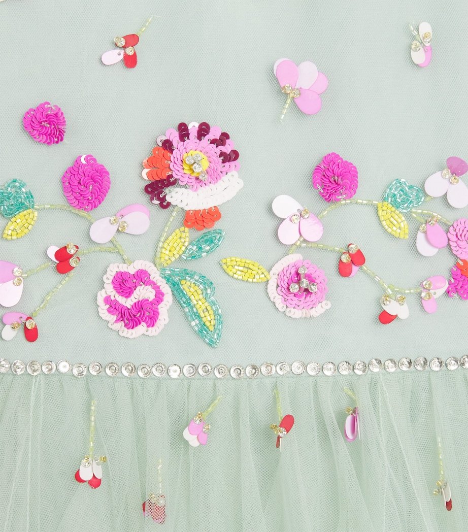 Jenny Packham’s creations have long been celebrated for their exquisite craftsmanship and timeless beauty, earning admiration from royalty and fashion connoisseurs alike. This same philosophy shines through in the Jenny Packham Kids collection, exemplified fully in its enchanting dresses. Delicately adorned with beaded floral embellishments across the bodice and rhinestones at the collar, this dress flows into a voluminous tulle skirt that showcases meticulous attention.