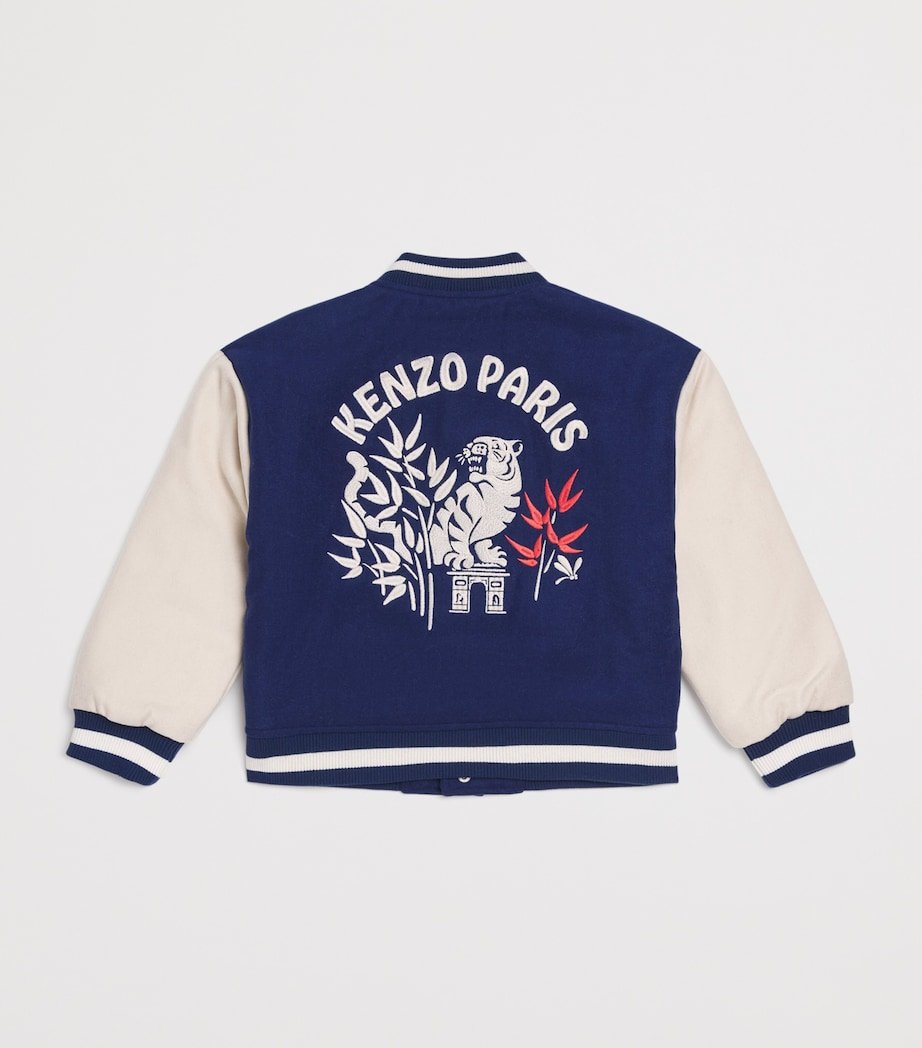 Blending the classic Americana sporting aesthetic with KENZO’s Japanese inspirations, this varsity jacket from the Kids line features the hallmarks of the athletic style with the label’s classic motifs. The back is adorned with the brand logo atop a tiger with its front feet perched on an archway, showcasing the Maison’s mixed identity.