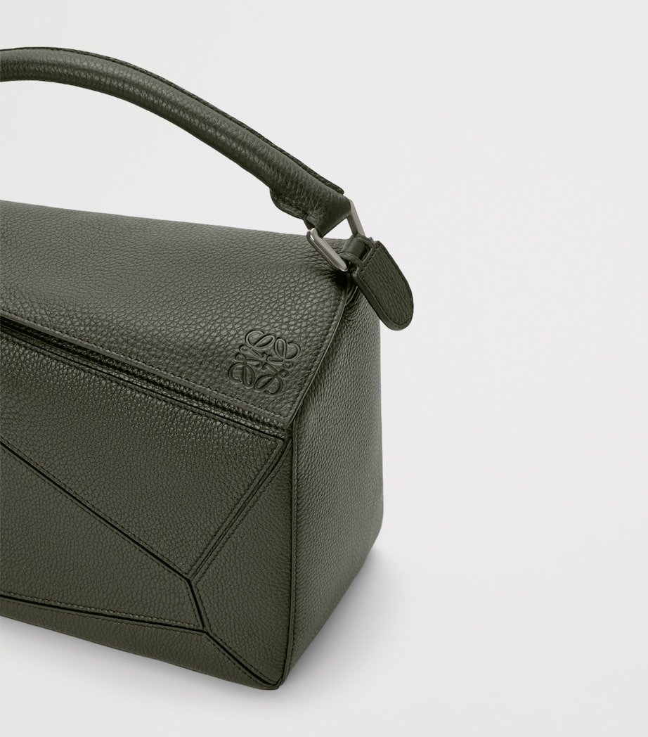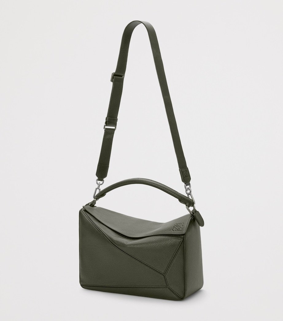 Designed in 2014, the Puzzle bag from LOEWE exudes modern artistry with its innovative cuboid shape – one that takes 524 actions to complete and perfect. This grained calfskin iteration emphasises the origami-like construction with overlapping panels, paving the way for it to be conveniently folded completely flat.