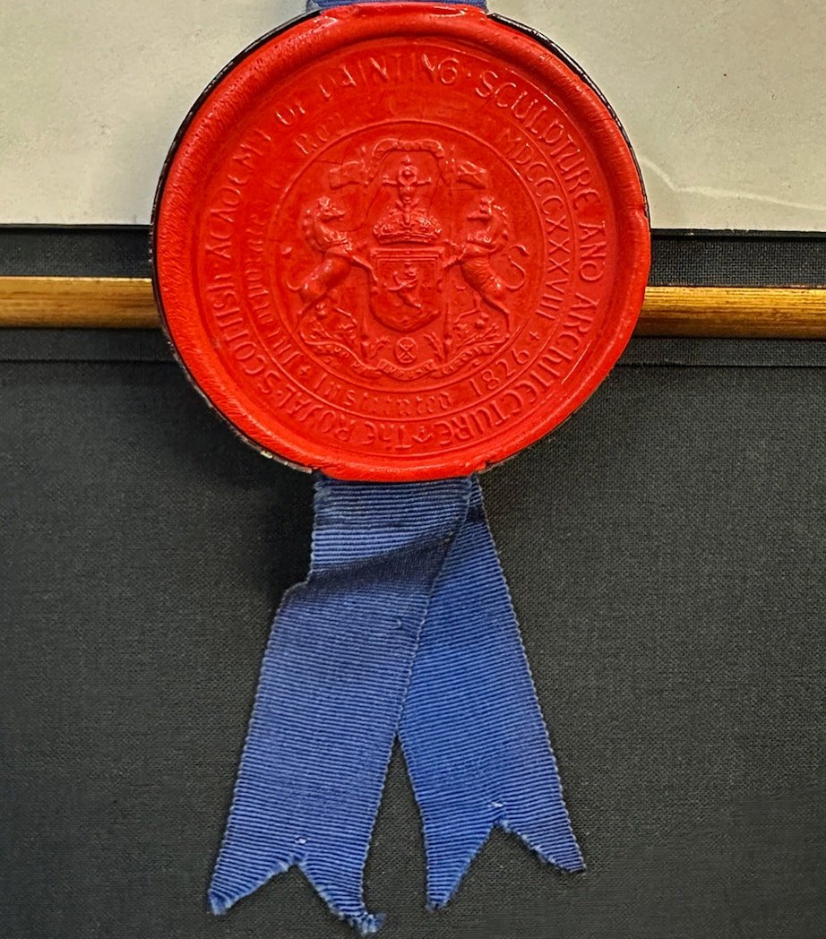 A bespoke Leipzig Galleries display presenting the official Diploma of Scottish painter William Crosbie, conferred by the Royal Scottish Academy of Painting, Sculpture and Architecture – and bearing the fountain-ink signature of Her Majesty The Queen, signed 10th February 1954 in Edinburgh. From the estate of William Crosbie, whose works grace Scotland’s most prestigious museums and form part of the Royal Collection, this archival piece embodies a chapter of artistic and royal heritage that resonates with connoisseurs of fine art and admirers of enduring tradition.