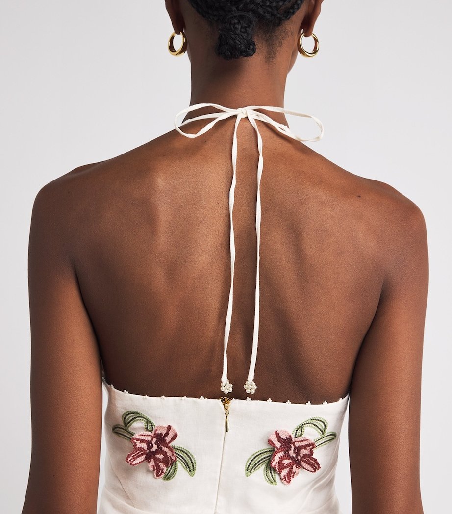 Agua by Agua Bendita brings its Colombian artistry techniques to the fore in the Balsa Cordillera midi dress. Featuring 64 hours of embroidery – evident in the intricacy of the design – this piece is crafted from lightweight linen and spotlights a scalloped halterneck.