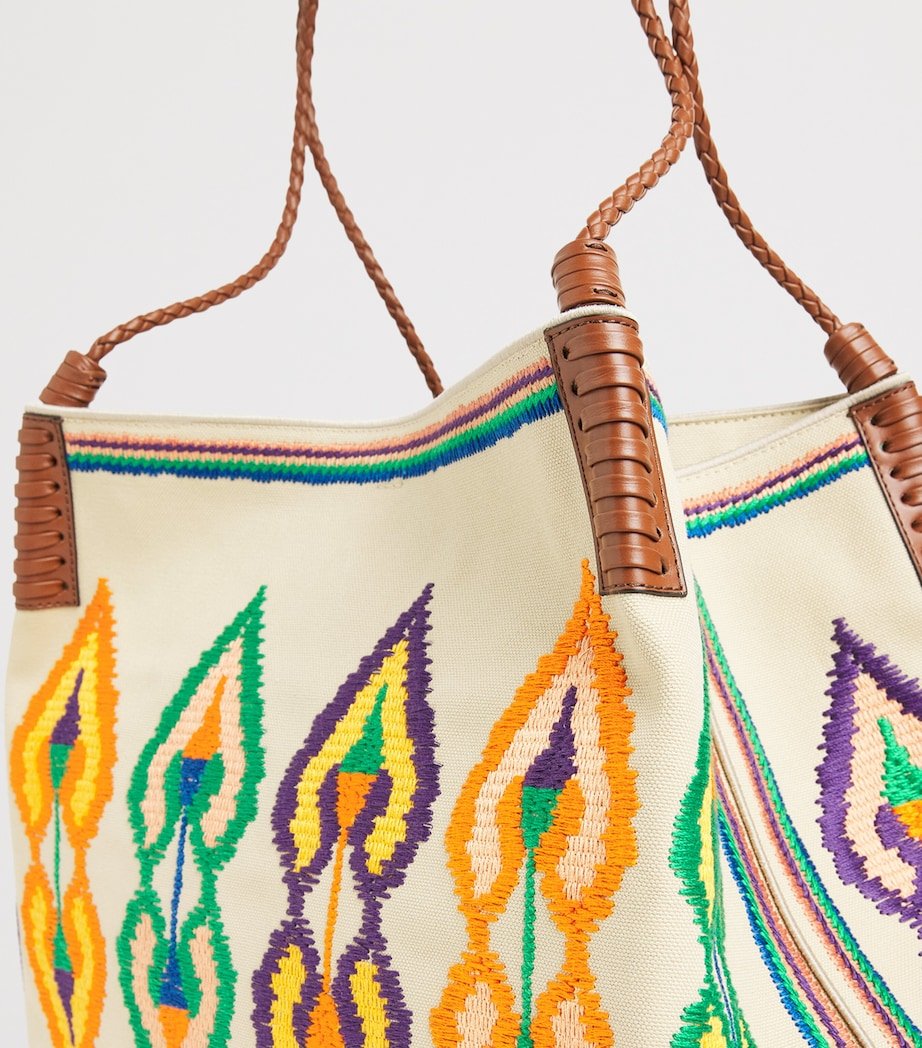 Embellished with vibrant geometric embroidery, Etro’s Libra shoulder bag encapsulates the label’s bohemian spirit with a note of on-the-go practicality. Equipped with ample space inside, the cotton canvas profile is suspended by large woven calfskin handles, allowing for easy carrying from the beach to the city.