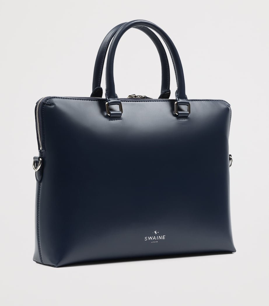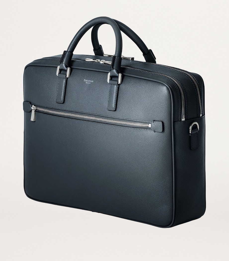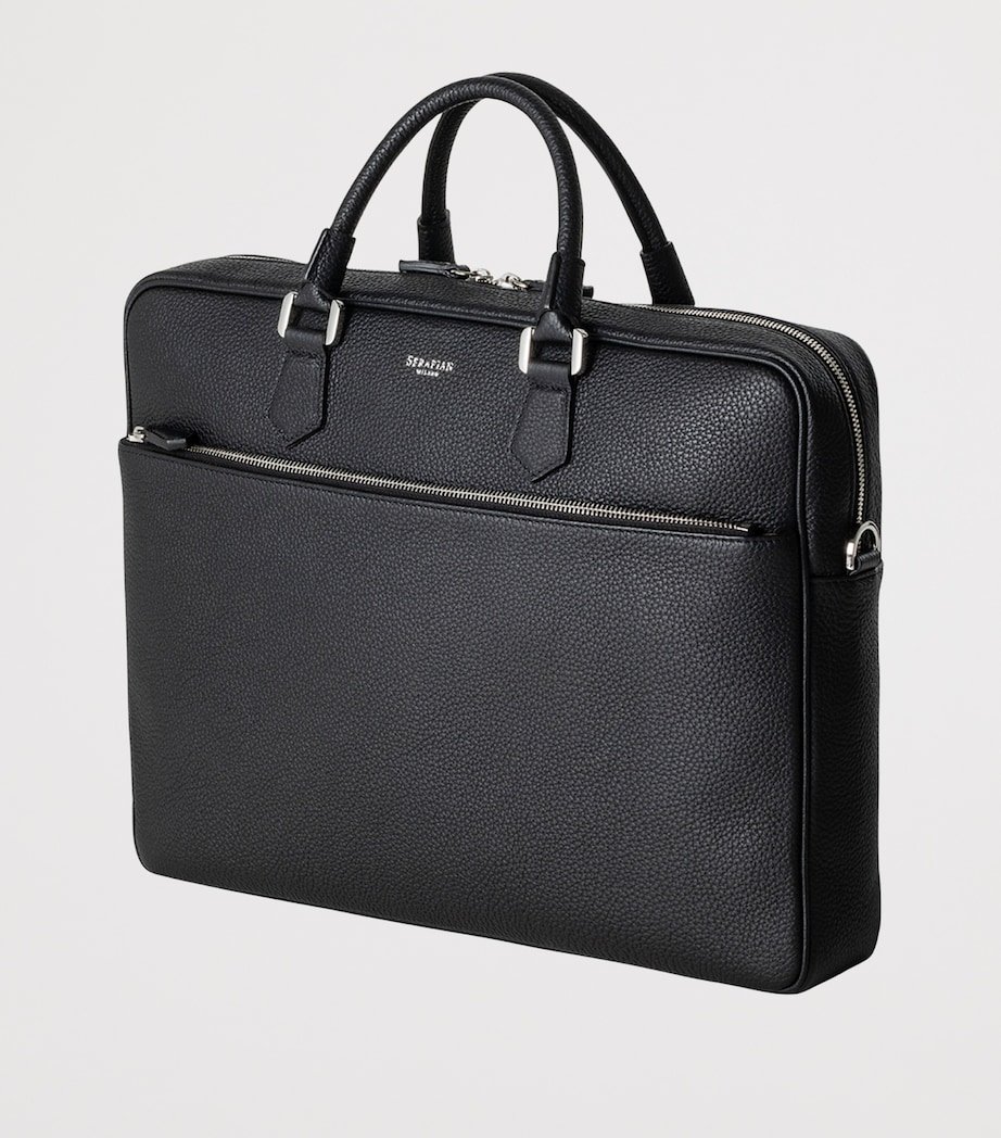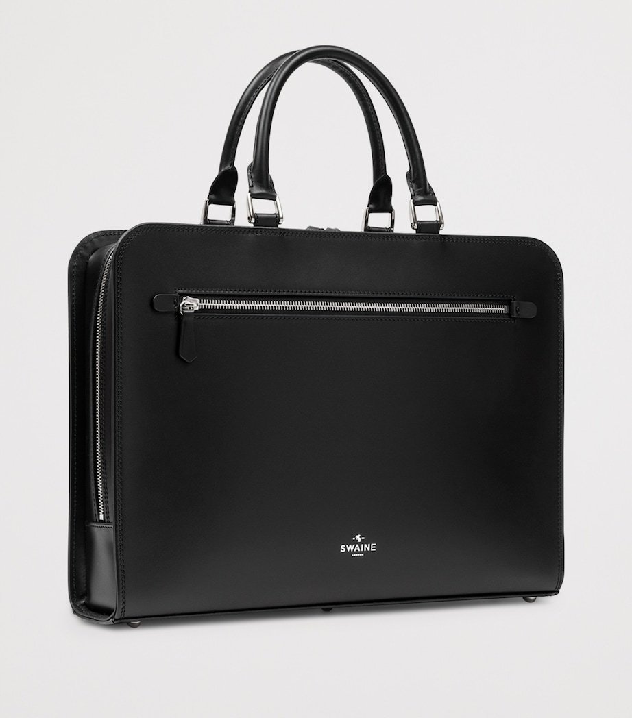 Sleek and versatile, this Thom Browne calf leather folio bag features the signature detachable red, white and blue stripe for a custom finish. Designed for work or travel, it carries essentials with polished precision and unmistakable Thom character.