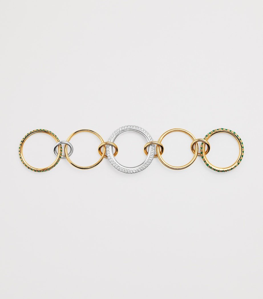 Spinelli Kilcollin’s creative ingenuity is what strikes first when laying eyes upon its range of unique jewellery designs, but the label’s penchant for impeccable craftsmanship is certainly a close second. Handmade in Los Angeles, the Chloe ring pairs five multi-gauge bands, of which the central is encrusted with diamonds and the outer two feature emeralds, with orbiting connectors in sterling silver and yellow gold.