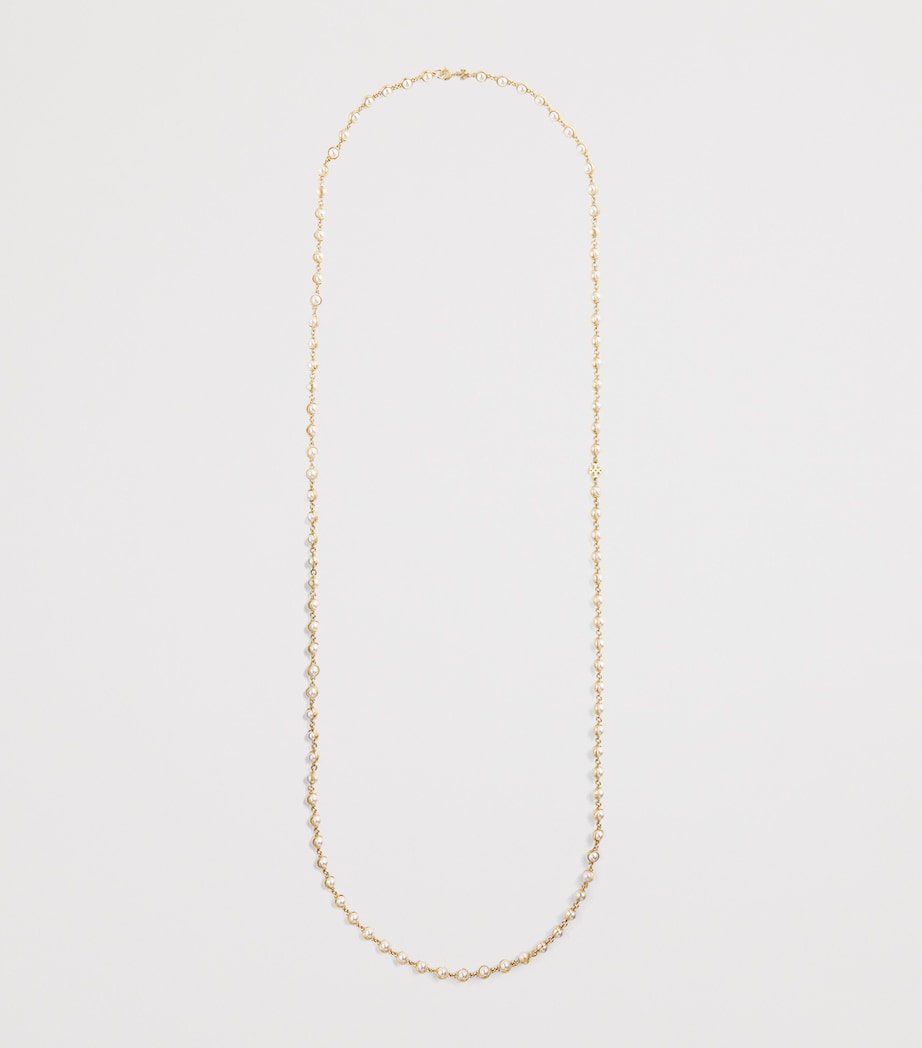 Tory Burch continues its celebration of pearls with this necklace. The brass profile has a delicate chain that’s utterly illuminated with the dainty circular gemstones and subtle Double T monogram. The longer length allows this design to be strung once or twice around your neck, complementing evening gowns and open shirts alike.
