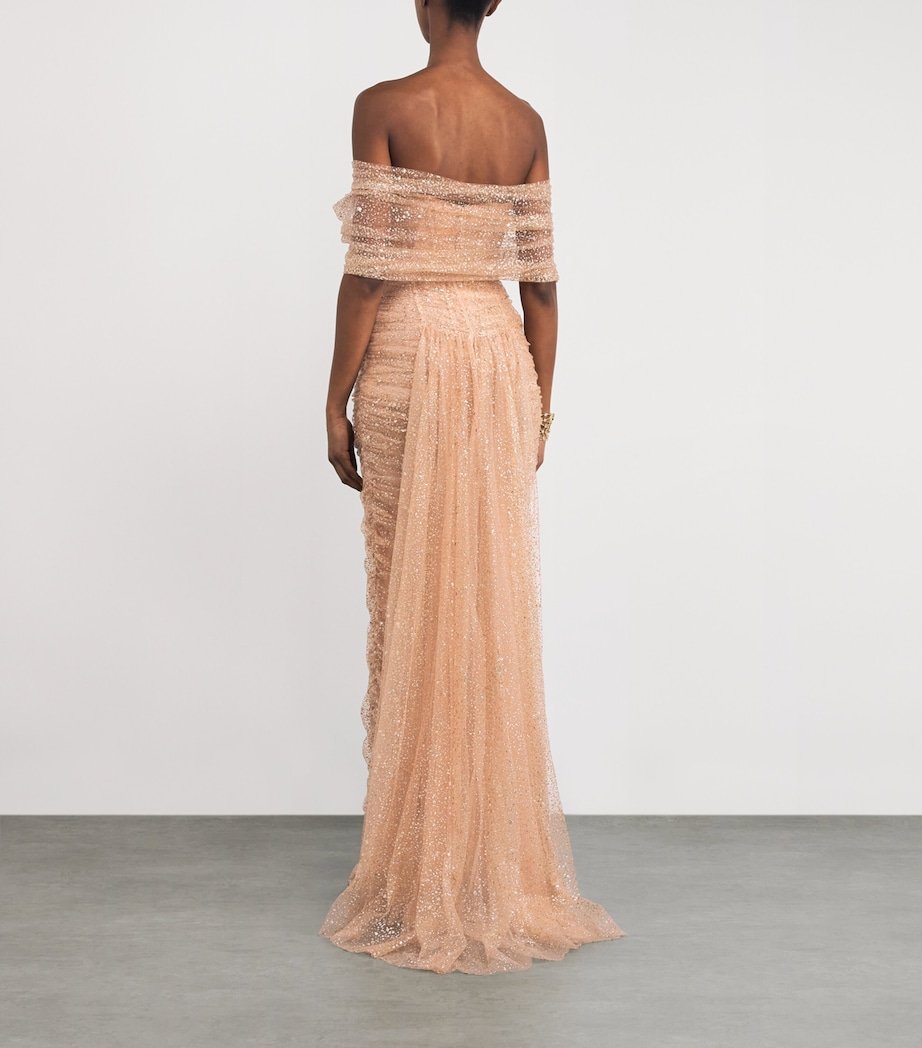 With a passion for painting and art in all its forms, Sandra Mansour launched her eponymous label to offer timeless silhouettes, opting for draped tulle as the brush to paint this La Rose gown. Here, the brand’s eye for glittering details shines through in a flattering off-the-shoulder design, sure to garner adoration at your next evening engagement.
