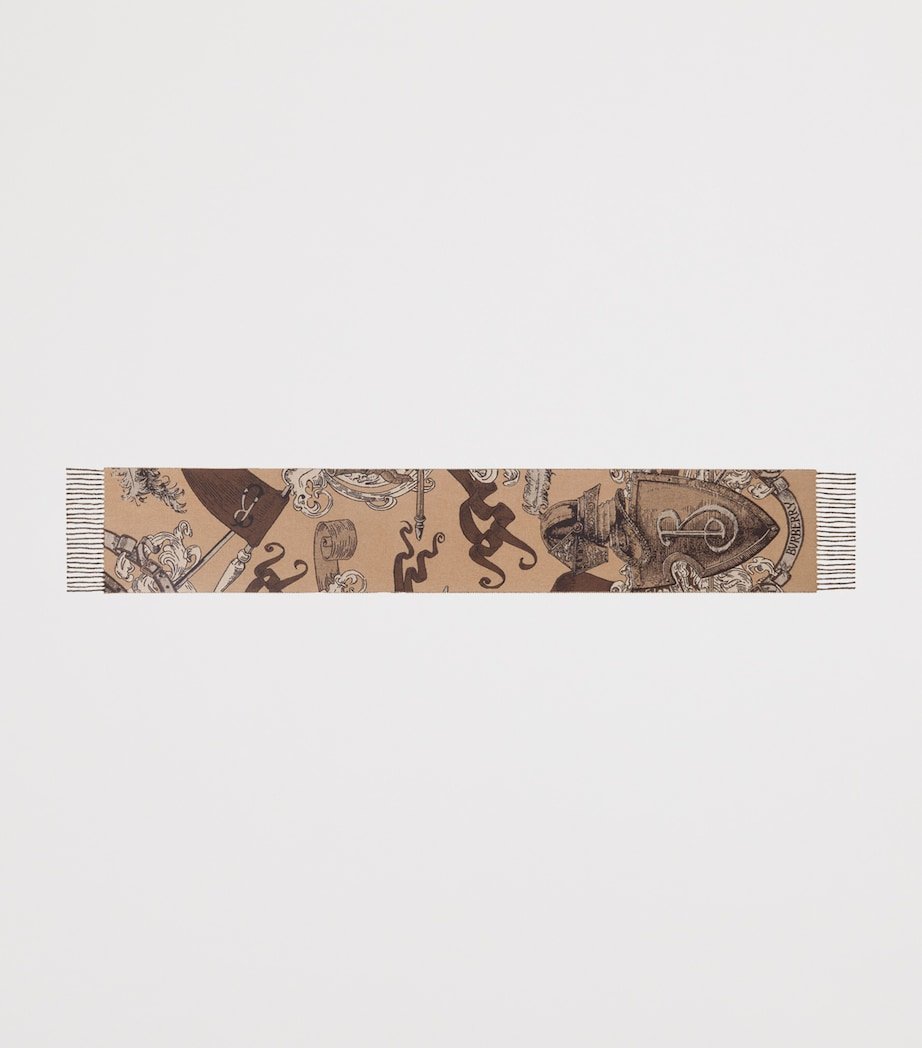 A tribute to the brand’s roots, this Burberry scarf captures the essence of London through hand-drawn illustrations of its most iconic landmarks – from Tower Bridge to Burberry’s own Horseferry House. Crafted in Italy from smooth silk twill with hand-rolled edges, it’s a wearable piece of heritage that tells a story with every fold.