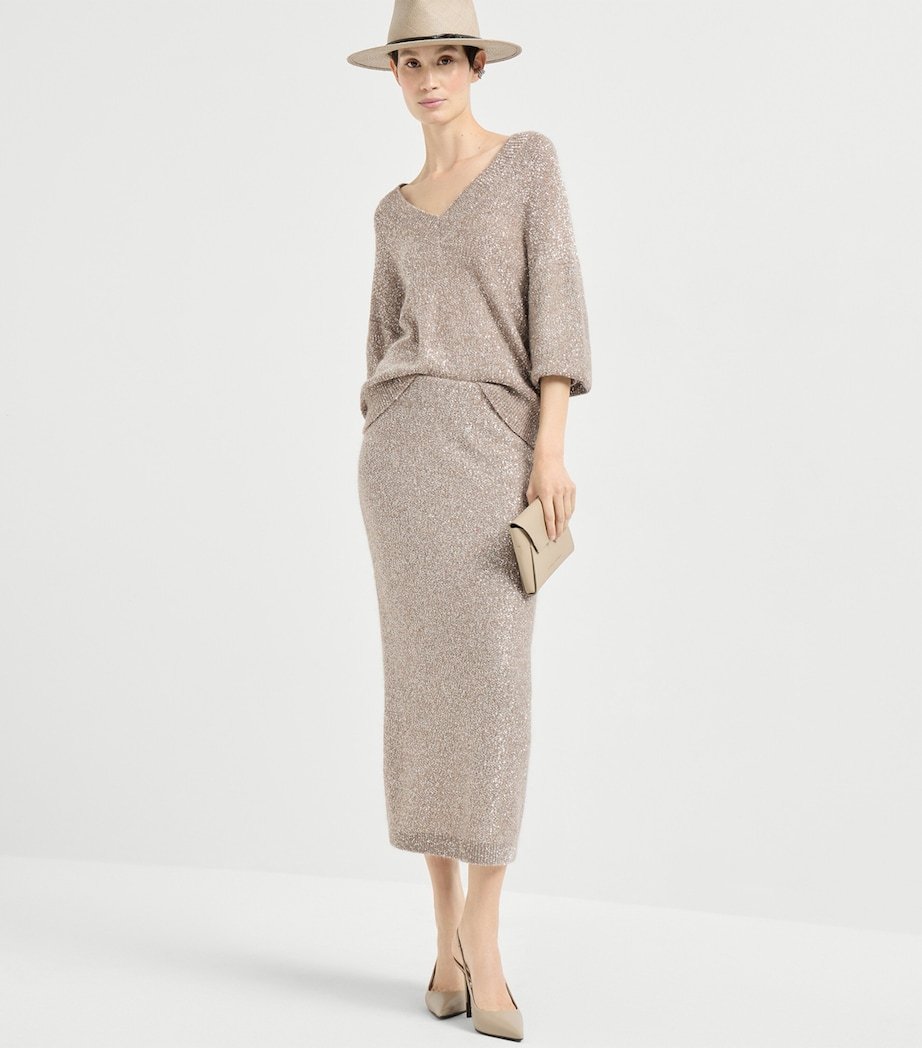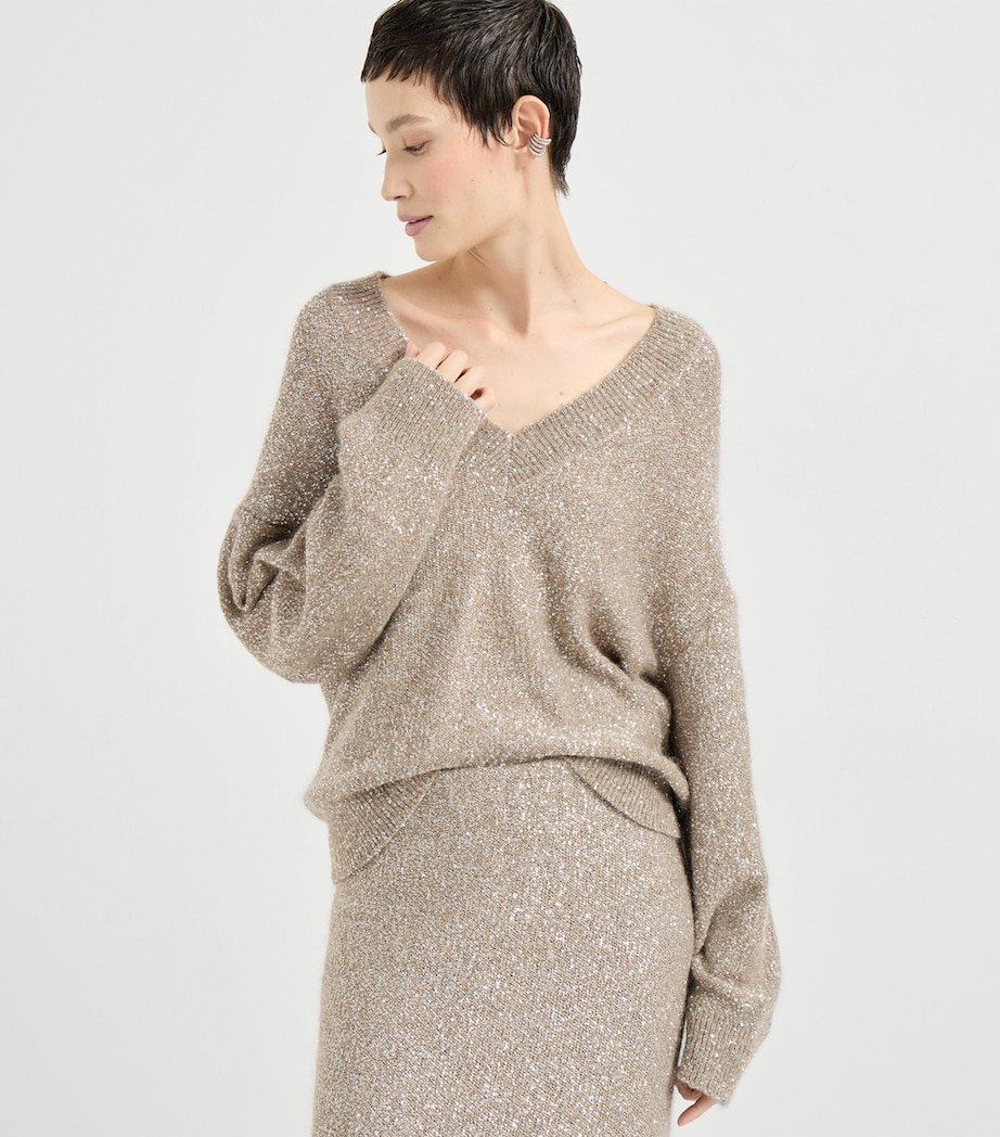 Brunello Cucinelli takes a shimmering approach to knitwear with this V-neck sweater. Infused with mohair fibres, the dropped shoulder silhouette is crafted with glimmering threads, offering a subtle touch of glamour for your collection of knitwear.