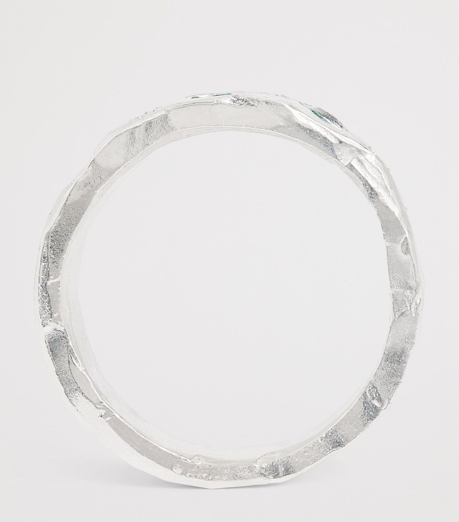 Pieces from The Ouze are distinctive – a brand that explores imperfect versions of jewellery with unfinished forms and hand grooves. The Scatter Heart ring embodies this philosophy, crafted from recycled sterling silver and embedded with uneven emeralds for a purposely weathered finish.