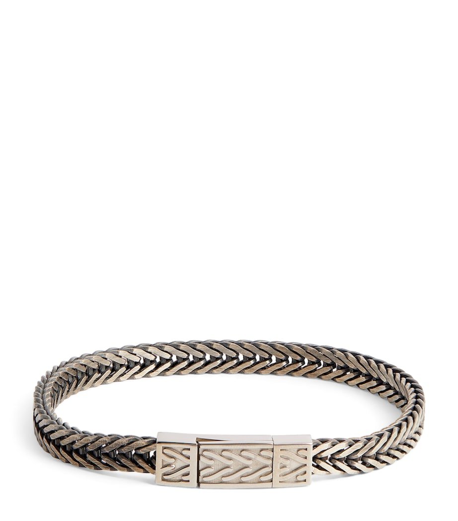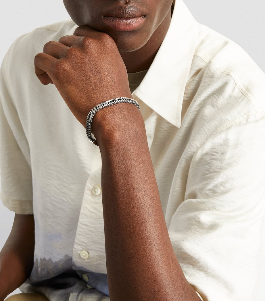 Ever the contemporary, Tateossian incorporates a unique herringbone pattern into the chain of this sterling silver bracelet. Its hand-carved clasp lends the perfect accompaniment to the geometric look, while a glimmering metallic profile affirms its stackable status.