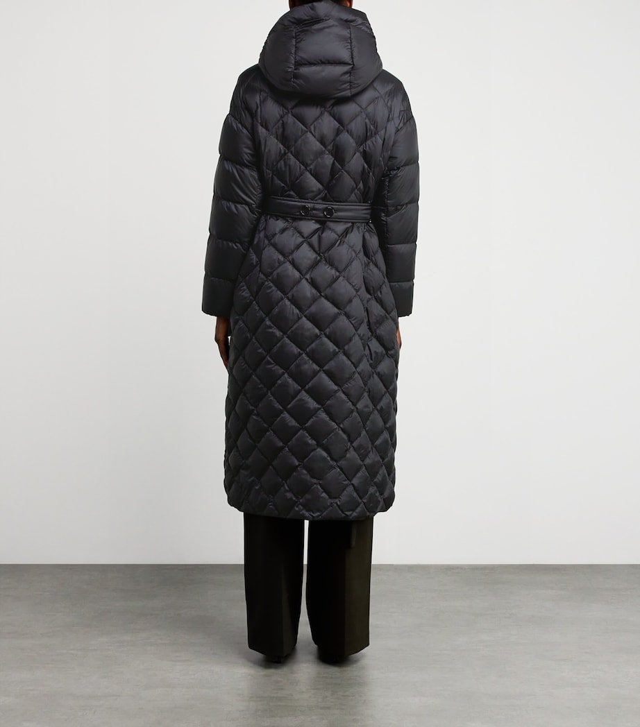 Max Mara extends the down jacket into a long silhouette, refined by diamond quilting and a removable belt secured with horn buttons. Side splits with snap fastenings lend movement and versatility, while goose-down padding, a drawstring hood and welt pockets balance functional warmth with the House’s measured restraint.