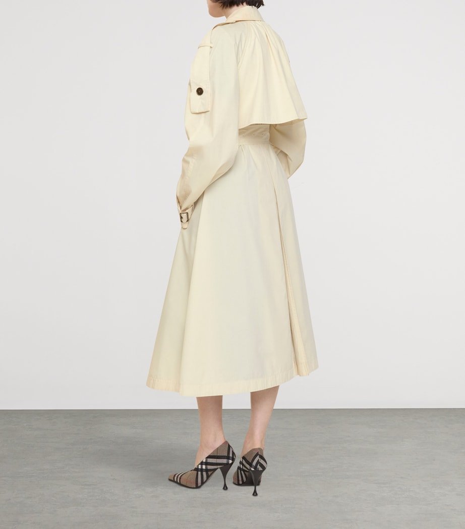 The Burberry Trerose trench coat offers a modern interpretation of a classic silhouette by integrating elegant scarf ties at the neck that can be styled as a dramatic bow. Crafted from a lightweight canvas, the design features a slim fit-and-flare shape that can be cinched with a detachable belt to highlight a tailored profile.
