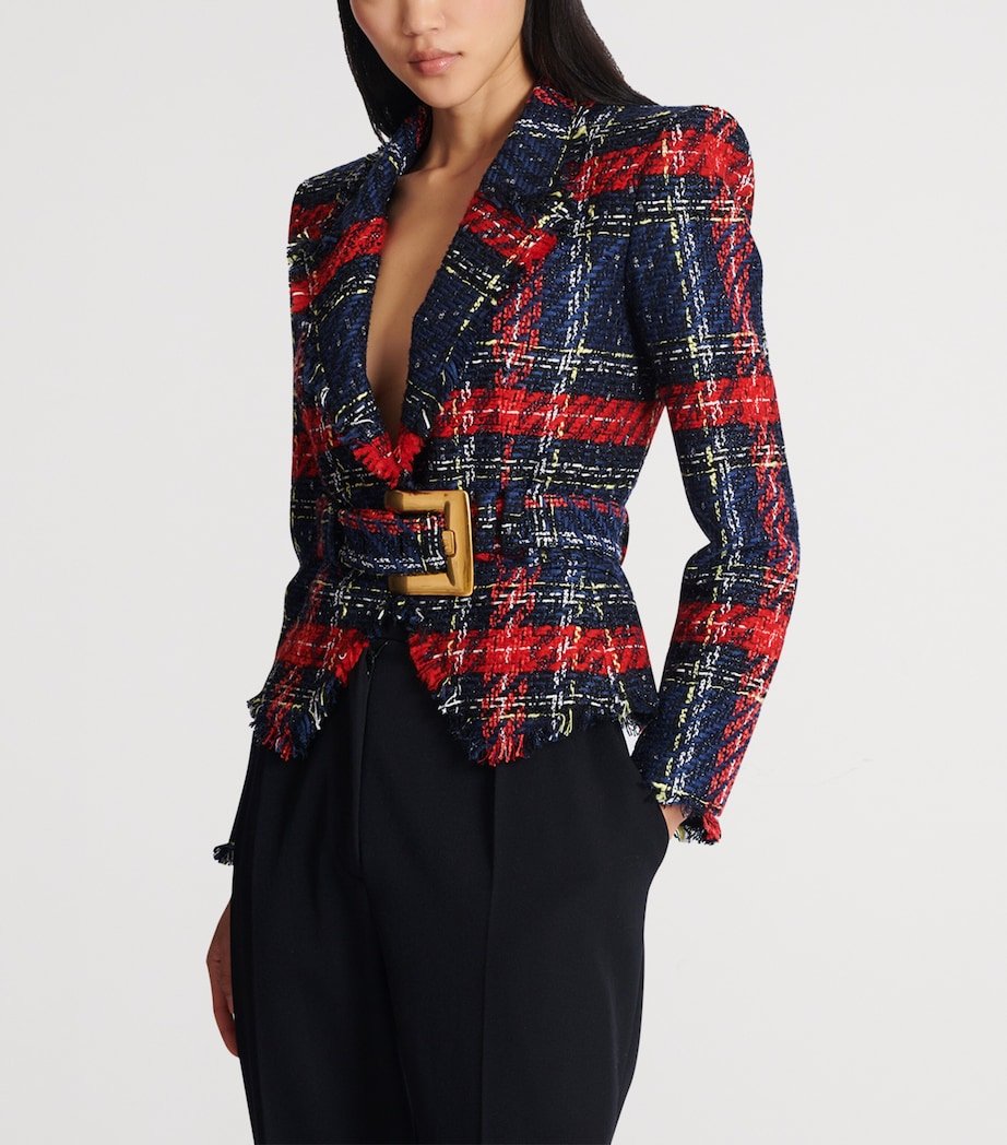 From its founding in 1945 to the current day, Balmain has continually been driven by impeccable tailoring, a vision expressed to vibrant effect in this jacket. Cut from red and blue tweed, its amplified shoulders are matched by the oversized belt buckle, which cinches in the waist for a classic Balmain silhouette.
