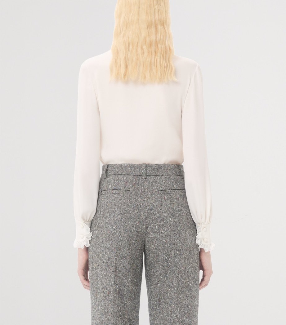 Valentino has always woven romance into restraint, turning simplicity into theatre with the lightest of gestures. This shirt captures that spirit with its clean silhouette edged in delicate frills at the collar and cuffs – a quiet flourish that speaks volumes.