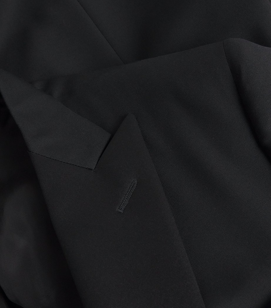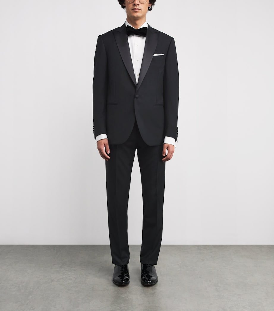 Italian label Corneliani doesn’t do tailored attire by halves. This two-piece tuxedo is made in Italy from pure virgin wool and trimmed with satin on the peak lapels, buttons and trousers to present a cohesive and sophisticated aesthetic. The single-breasted silhouette speaks to the refinement of the modern gentleman, while practical considerations such as the blazer’s double-vented reverse and the trousers’ waistline suspender buttons make dressing for your next engagement a fuss-free affair.