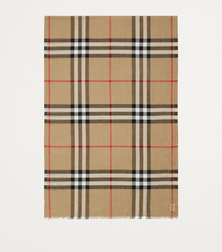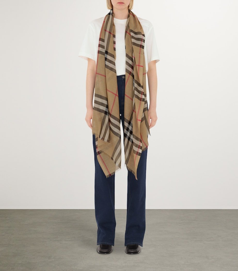 While Burberry may have several monikers to stamp its designs with, arguably none of them are as widely recognised as the label’s check. First used as lining for its trench coats, the pattern is revisited in various colour palettes every season for garments and accessories such as this scarf.