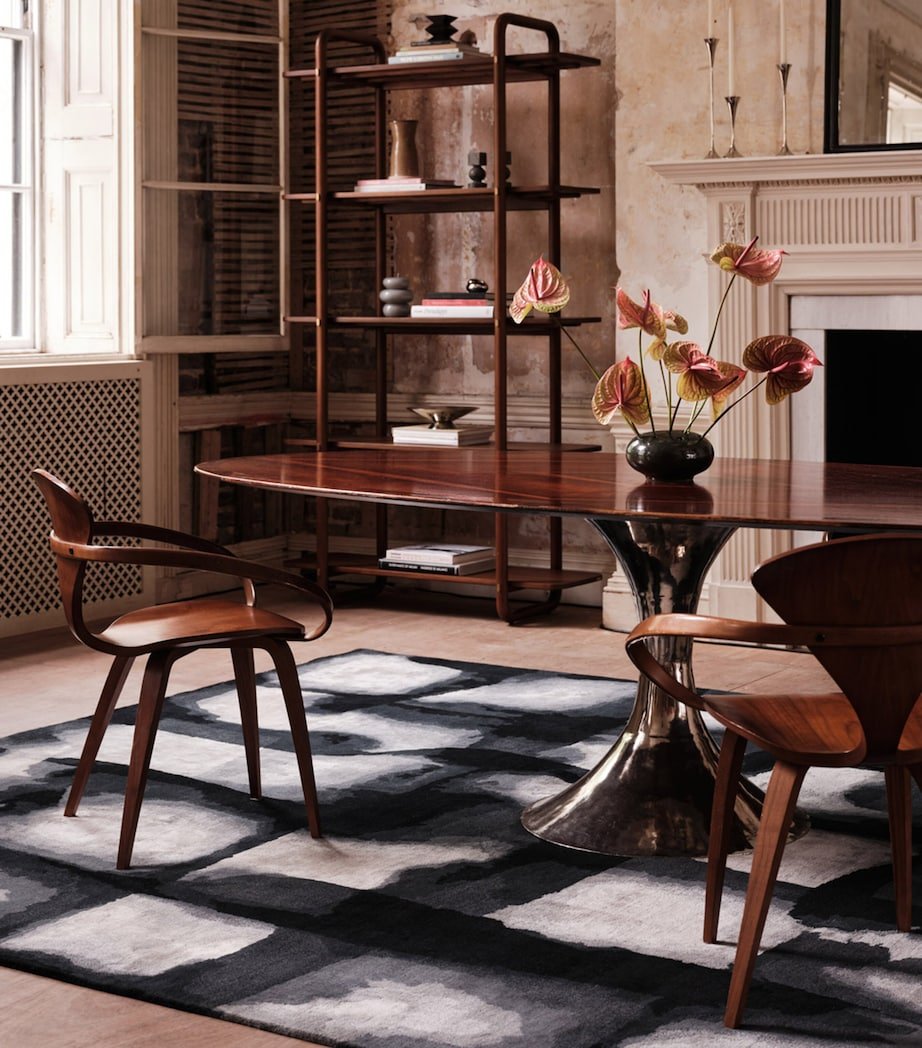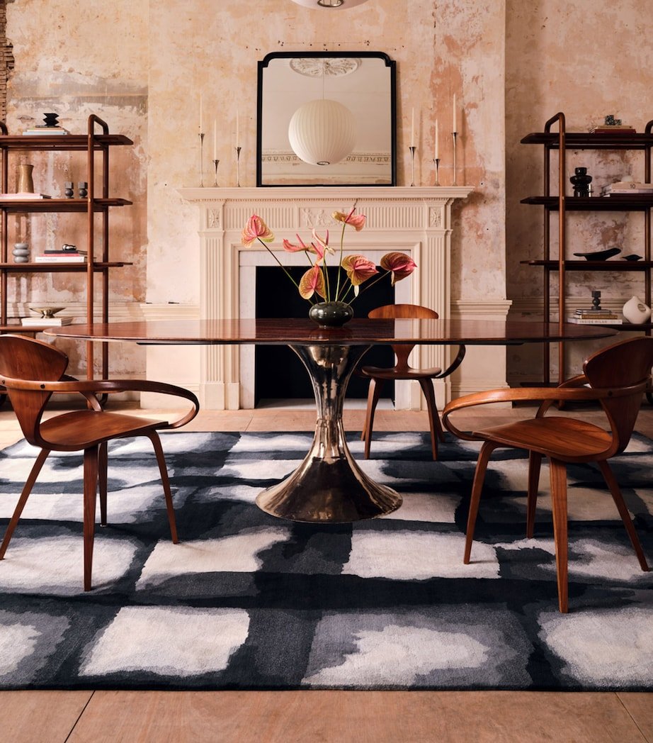 Inspired by an original hand-painted composition from The Rug Company’s studio, the Solu Night rug is something of a masterpiece in and of itself. Windowpane motifs dance across its surface, light pouring from the cracks within its dark tonal palette, while a sumptuous wool-silk blend offers a velvety softness. Akin to a starry night sky, this piece exemplifies the brand’s exceptional craftsmanship and penchant for elevating spaces through codes of comfort and refinement.